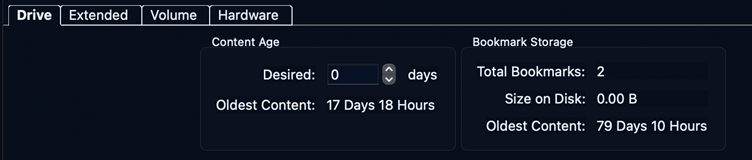 - In exacqVision Client, open Config (Setup) → Storage → Drive tab and record “Oldest recorded video” (Content Age).