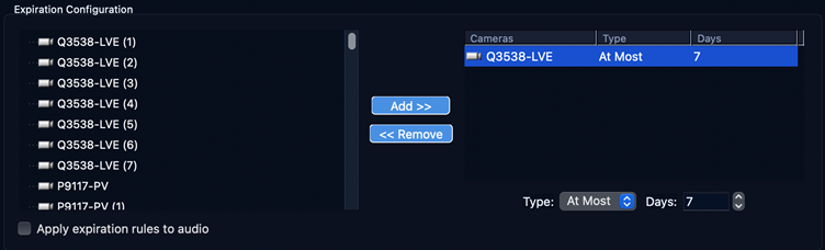 | Age-based (expiration) | Expiration rules delete video after a configured period (per-camera min/max). | Video older than the configured limit is removed; behavior is consistent and predictable. | Video newer than the configured limit disappears; deletion happens on only some cameras without matching rules. |